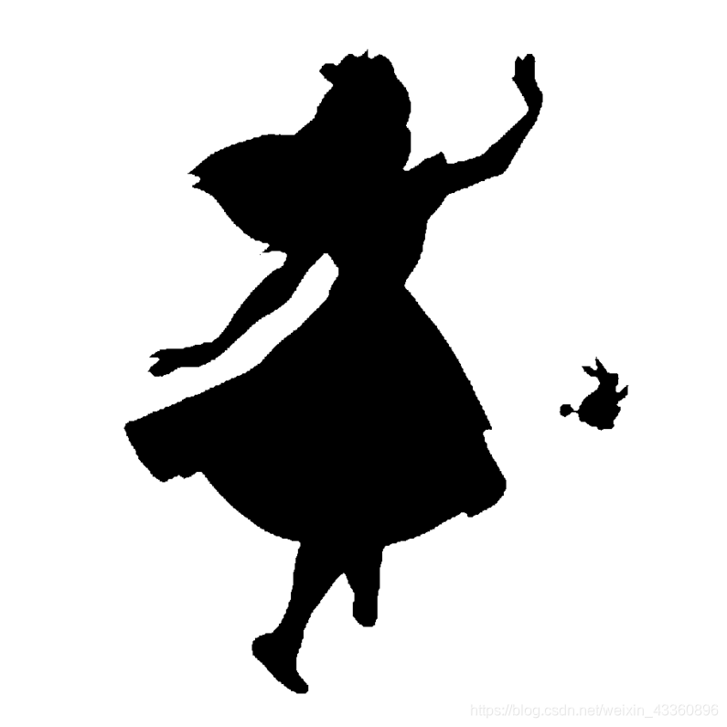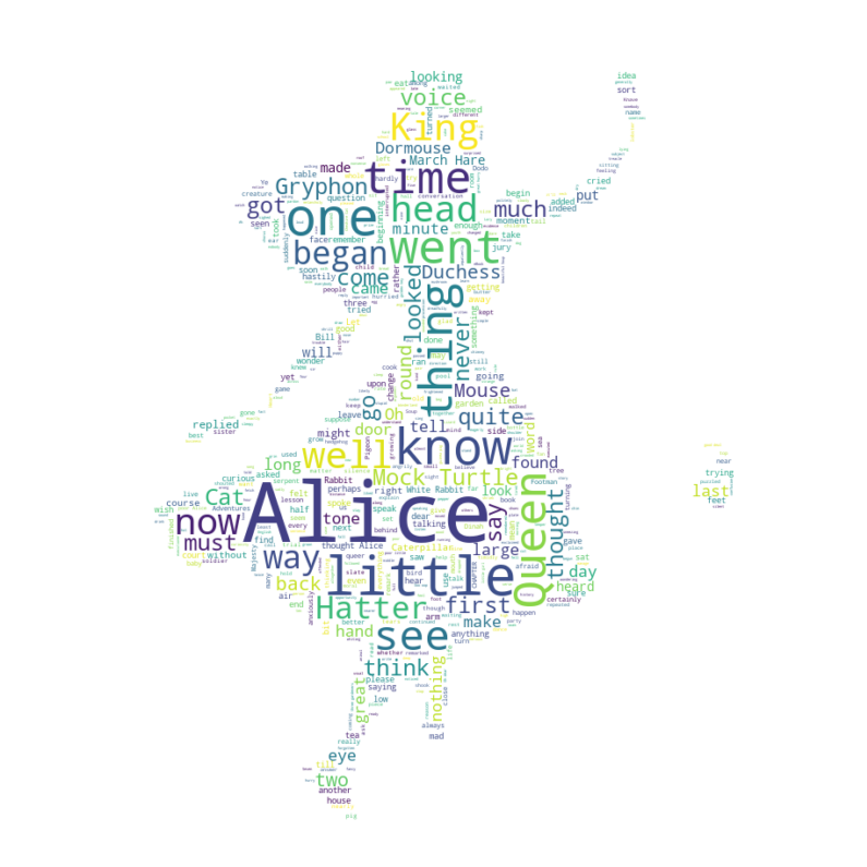 Excellent! This looks really interesting! Another cool thing you can implement with the word_cloud package is superimposing the words onto a mask of any shape. Let’s use a mask of Alice and her rabbit. We already created the mask for you, so let’s go ahead and download it and call it _alice_mask.png_.
