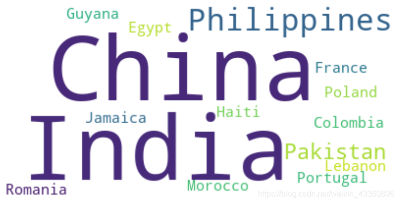 'China China China China China China China China China Colombia Egypt France Guyana Haiti India India India India India India India India India Jamaica Lebanon Morocco Pakistan Pakistan Pakistan Philippines Philippines Philippines Philippines Philippines Philippines Philippines Poland Portugal Romania 'We are not dealing with any stopwords here, so there is no need to pass them when creating the word cloud.